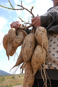畑で芋掘り、そこにあった草を燃やして芋を焼く、時間のあるときは大きな芋、急ぎたいときは小さい芋。アルミ箔なんかに本当は包みません。土と灰の中にお芋を忍ばせておくと自然とホクホクした焼き芋に仕上がります。これが正しい野山の焼き芋。 |